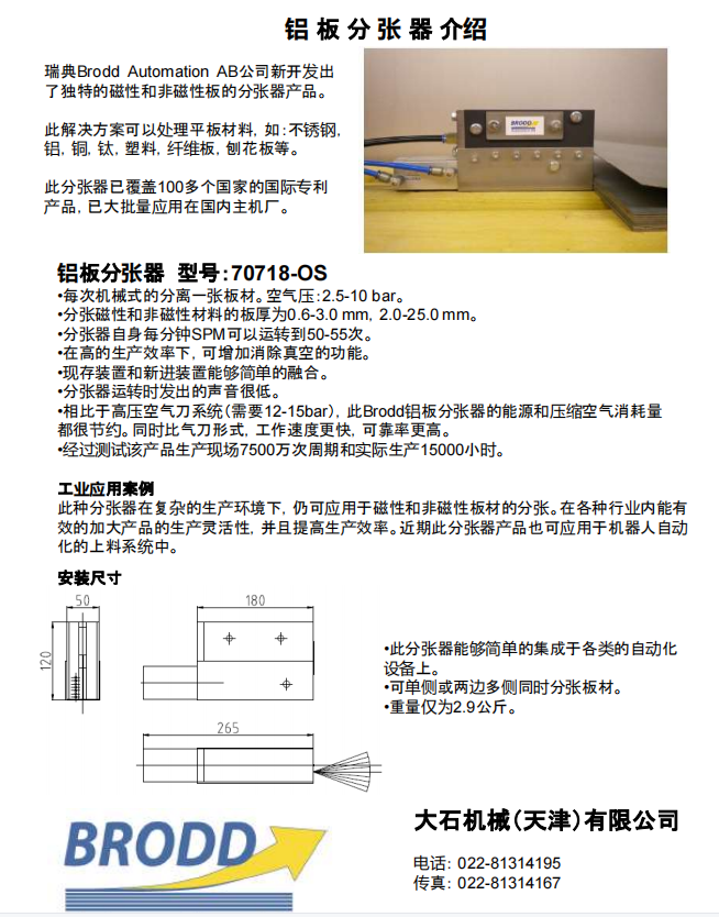 ·瑞典BROAD鋁板分張器為氣動(dòng)-機(jī)械結(jié)構(gòu),適用鋁板、鋼板等材料的分張,抓取。